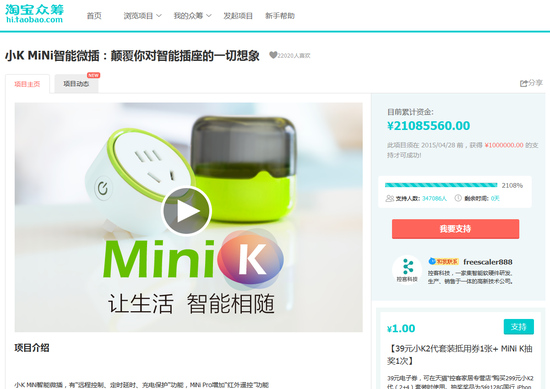 2015-05-05 14:42:36智能(néng)硬件(jiàn)蠻荒時代的(de)高(gāo)呼:小(xiǎo)K Mini創造中國衆籌神話(huà)【本文(wén)來自新浪新聞】4月(yuè)28日淩晨,我還沒睡(shuì),就是刻意再等一個(gè)意料之中的(de)破紀錄。即小(xiǎo)K Mini智能(néng)微插完成了在淘寶的(de)衆籌和(hé)首發,一個(gè)月(yuè)時間,以每台39元的(de)單價,籌到(dào)了21,141,909元,吸引了348,122個(gè)人(rén)的(de)參與。